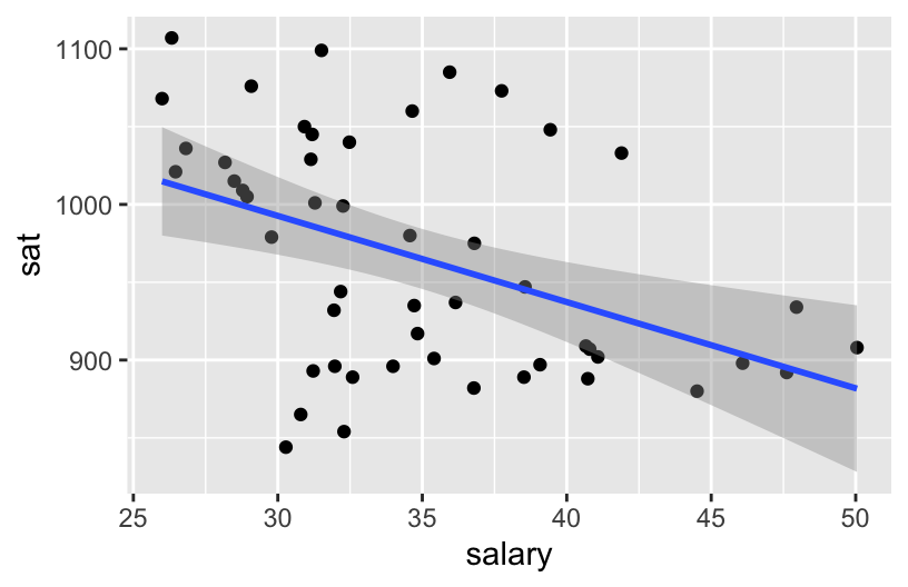 ## [1] 50 9We used scatterplots to explore how SAT scores related to spending per student and to teacher salaries: