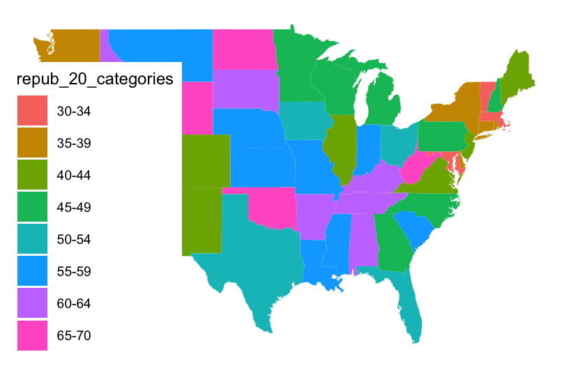 Now map Republican support by county. Let’s go straight to the discretized repub_20_categories variable, and a good color scale.