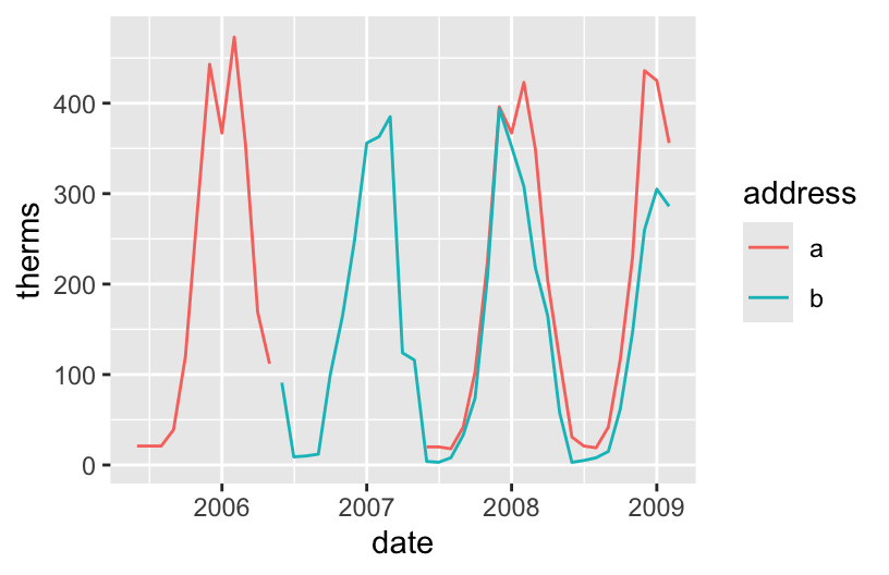 Both addresses used between 0 and 450 therms per month. There seem to be two types of months – those with lower use around 50 therms and those with higher use around 300/400 therms.