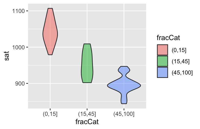 We explored a third variable: the fraction of students in the state that took the SAT (fracCat). This variable had a clear relationship with average SAT scores: