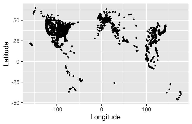 ggplot(starbucks, aes(y = Latitude, x = Longitude)) +
