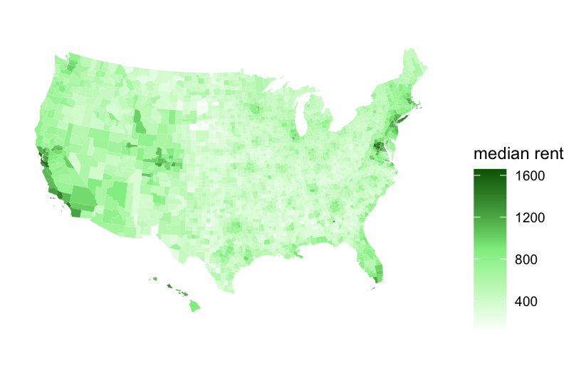 scale_fill_gradientn(name = "median rent", colors = c("white", "lightgreen", "darkgreen"))