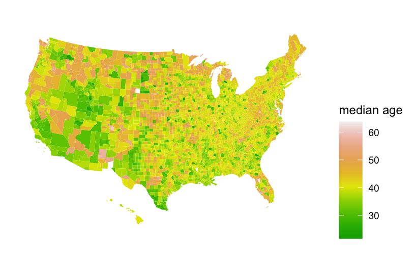 scale_fill_gradientn(name = "median age", colors = terrain.colors(10))